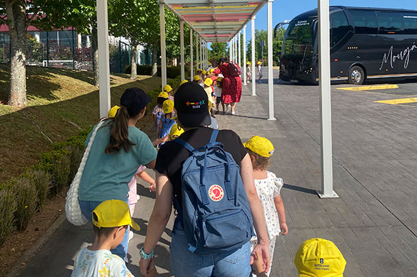 El colegio dispone de un servicio de transporte escolar que cubre las principales líneas de Santiago y sus alrededores. Los alumnos van acompañados de monitores en todo momento.