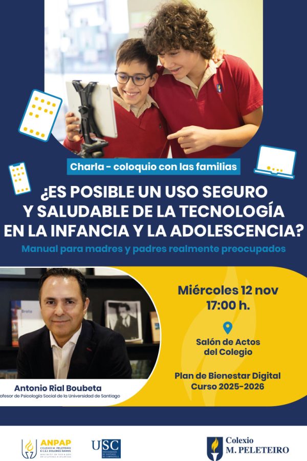En la primera sesión con las familias, con la que se abrió la segunda anualidad de nuestro Plan de Bienestar Digital, el profesor Rial Boubeta aprovechó para poner en valor el enorme esfuerzo realizado durante el curso anterior, los logros alcanzados y el ilusionante y complejo camino que queda todavía por recorrer juntos. Ha destacado una vez más la necesidad de adoptar una postura activa y comprometida por parte de toda la comunidad educativa, a la hora de abordar un problema que la OMS sigue destacando como un serio problema de salud pública.